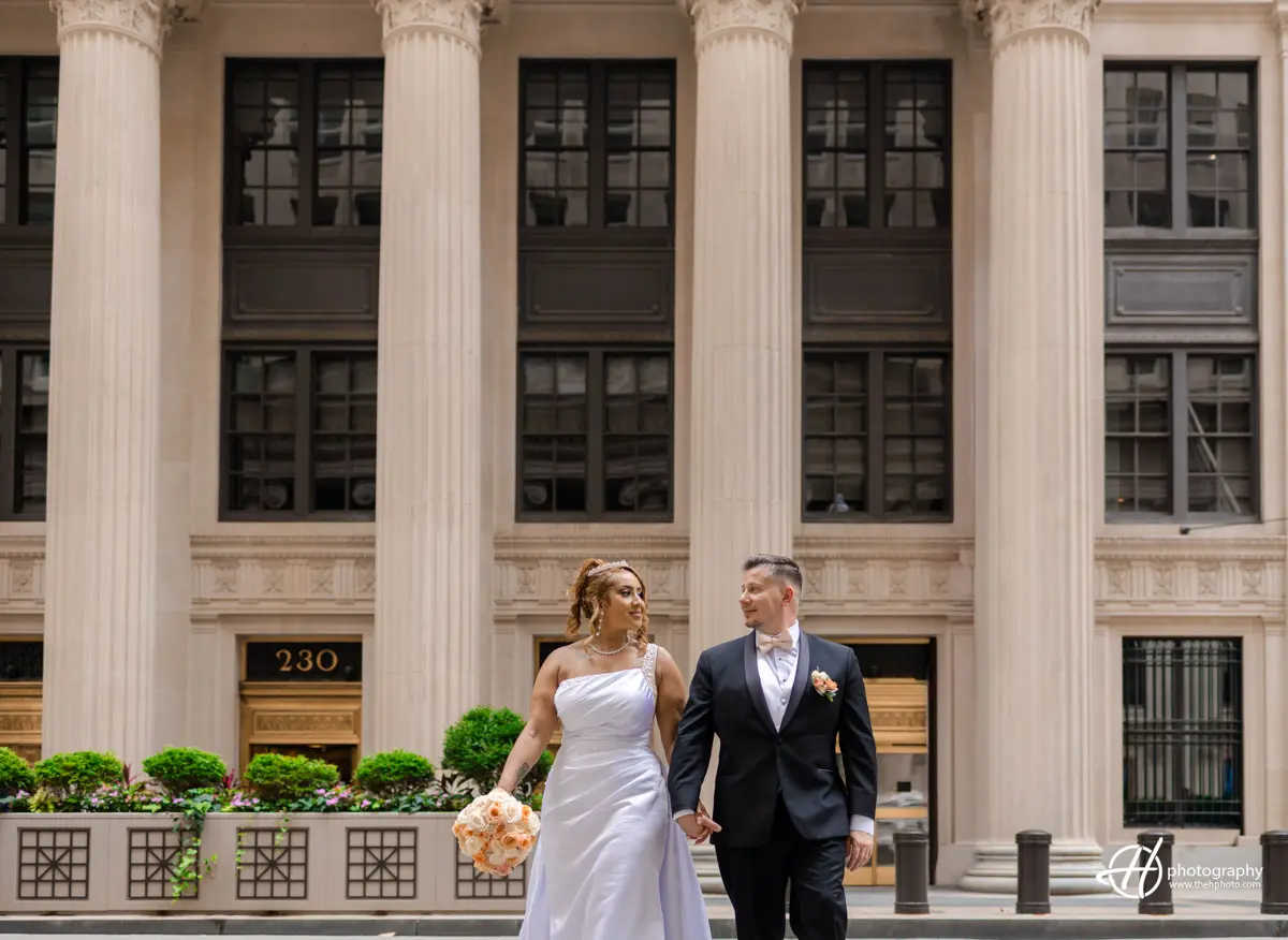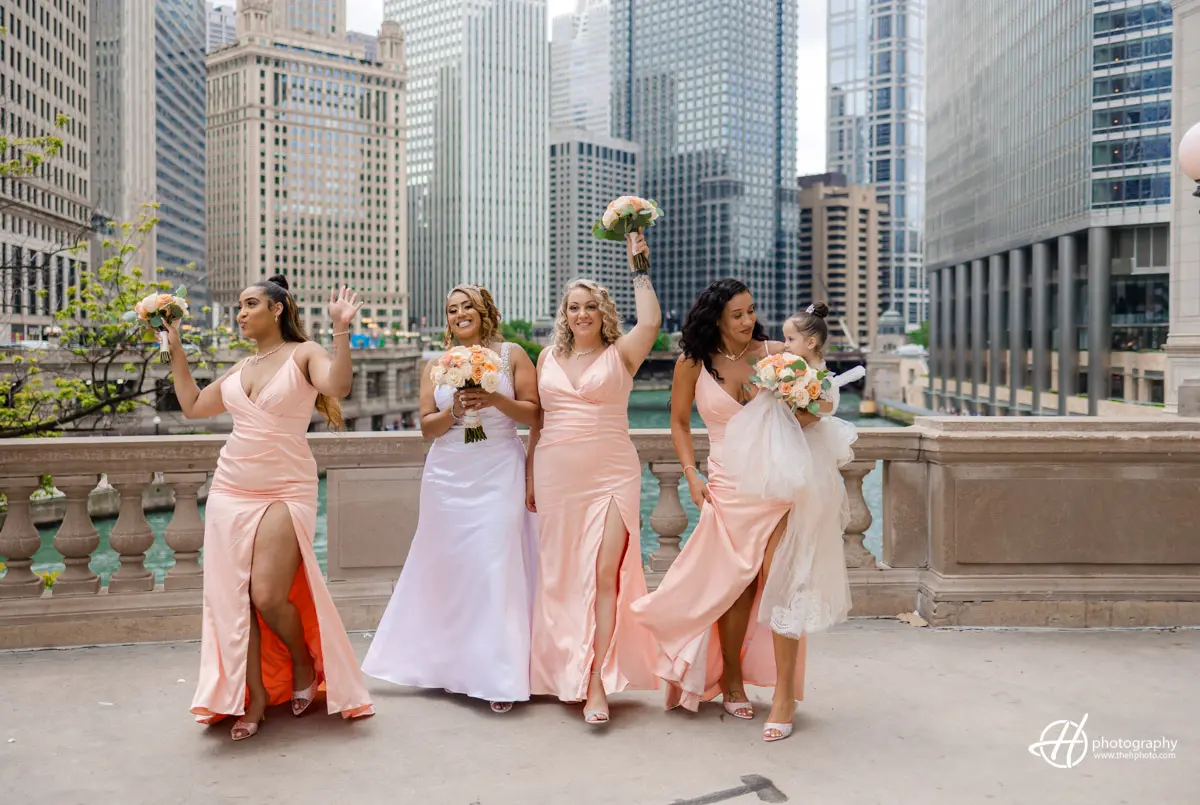 After the getting ready moments, the couple, along with their bridal party, godparents, and Brandy’s parents, boarded a limo and headed downtown. We stopped at some of Chicago’s most iconic locations — including the Magnificent Mile, Millennium Park, and the Chicago Board of Trade — for wedding portraits. These urban backdrops added timeless elegance and energy to their wedding photos.