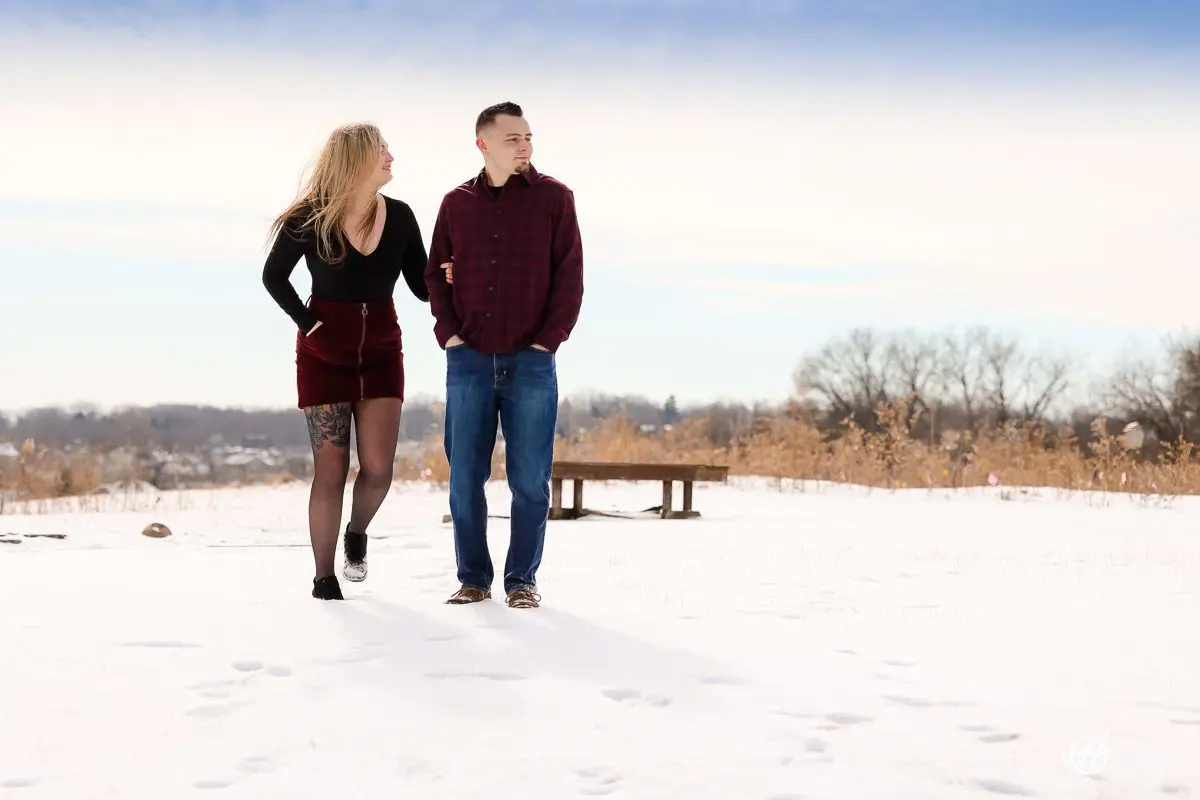 You don’t have to ask me twice to head to West Dundee – my happy place – for a winter engagement shoot! That’s where I photographed Karianne and Jamez, and it was a “snow blast!”