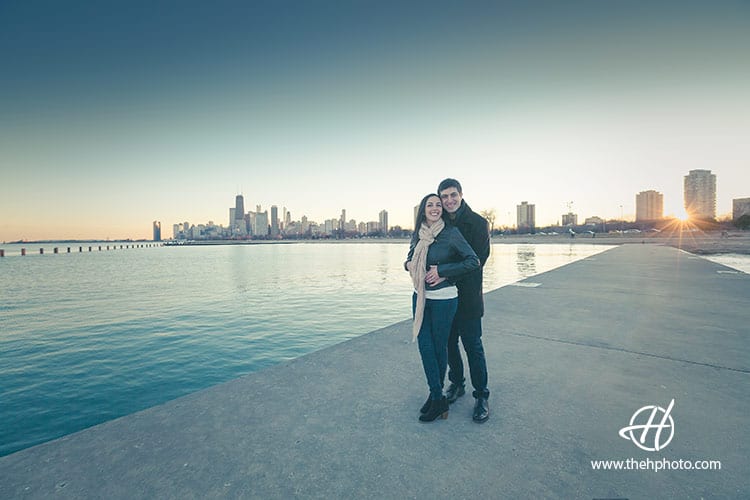 The newly engaged couple walked side by side together while at Lincoln Park. We were close to the water, so they decided to sit on the pier and we were lucky enough to get some ducks passing us by while we were shooting the photo session.