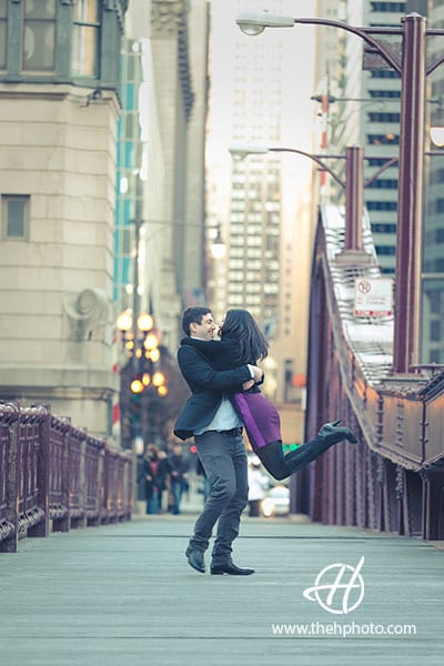 Once we were done photographing downtown, the couple was looking for a more excluded area in Chicago with less crowds so we headed over to La Salle Bridge. I love the architecture here and personally I think it gives a great opportunity for the couple to get more personal and romantic with one another. We captured a couple of shots of Michelle and Jerry walking hand and hand and Jerry swinging Michelle around in circles. I suggested we end the engagement photo session at Lincoln Park so we could see a little bit more of nature peaking through in the background.